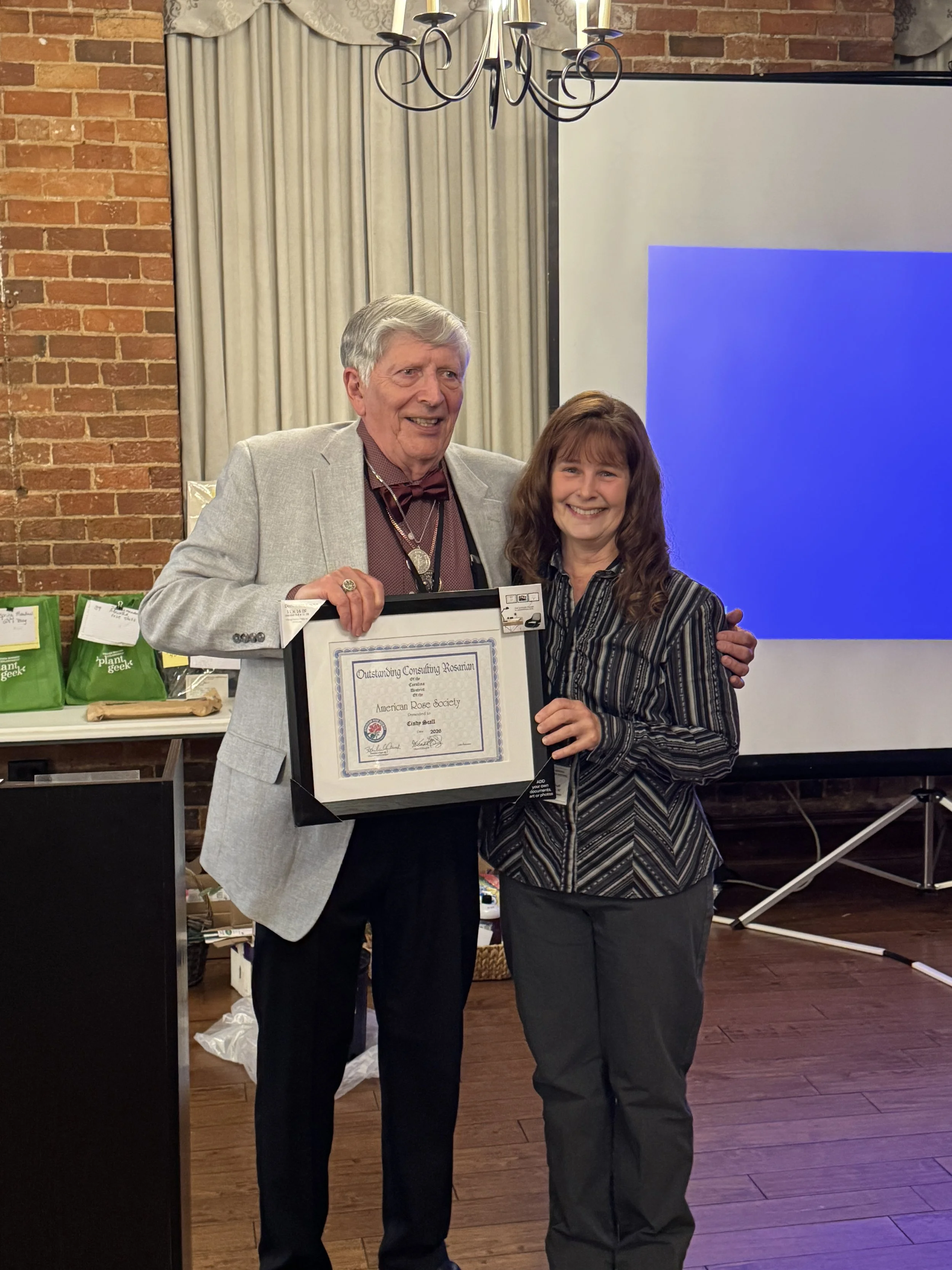 Cyndy Scalf was honored with the District 2026 Consulting Rosarian Award, by Ken Schmidt, the Carolina District Consultant Rosarian Chairperson.